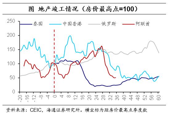 在有数据的13个经济体中的17个指标中,大部分经济体地产生产端见底需要的时间在20-30个季度,中位数为24个季度其中,相对见底回升较早的如英国,其开工和住宅投资数据,在房价开始下跌的5个和8个季度后就开始触底回升;另一个回升较早的经济体是阿联酋,其竣工数据从泡沫破裂的5个季度后就开始回升。