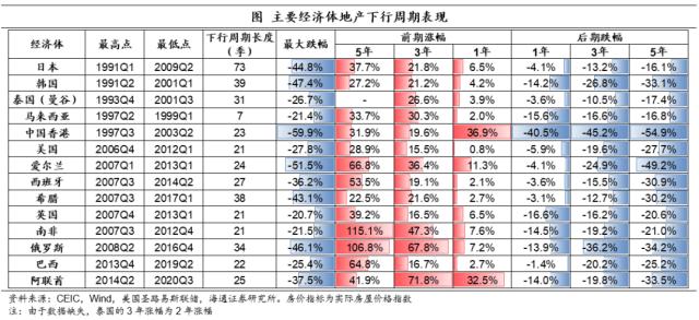 那么,当前地产市场的回暖,到底只是因为积压需求释放带来的短期震荡,还是意味着下行周期即将结束呢?参考海外经济体经历地产下行周期的经验,分析其他经济体地产下行周期的长度和深度,来判读当前我们地产下行周期是否已经结束。