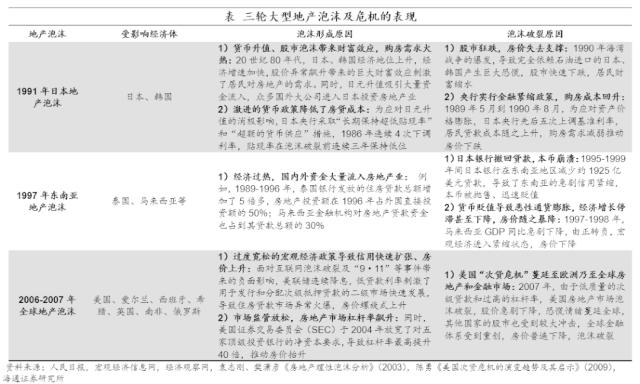 近三十年来,影响较大的三轮房地产泡沫破裂,分别是1991年日本地产泡沫、1997年东南亚地产泡沫和2007年由美国次贷危机引发的全球地产泡沫破裂除此之外,全球还发生过几轮小型地产泡沫,例如1991年的韩国、2013年的巴西、2014年的阿联酋(迪拜)房地产泡沫等。