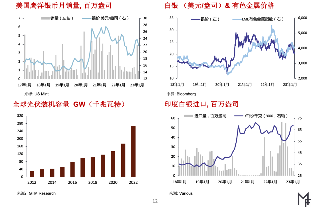 相比之下,受大力发展可再生能源政策的提振,光伏业和汽车业的白银需求则保持稳健增长预计今年光伏业的白银用量将大幅增长从2023年全年来看,我们预计一季度工业部门的白银需求会触及低点,但从二季度起需求有望逐步回升。