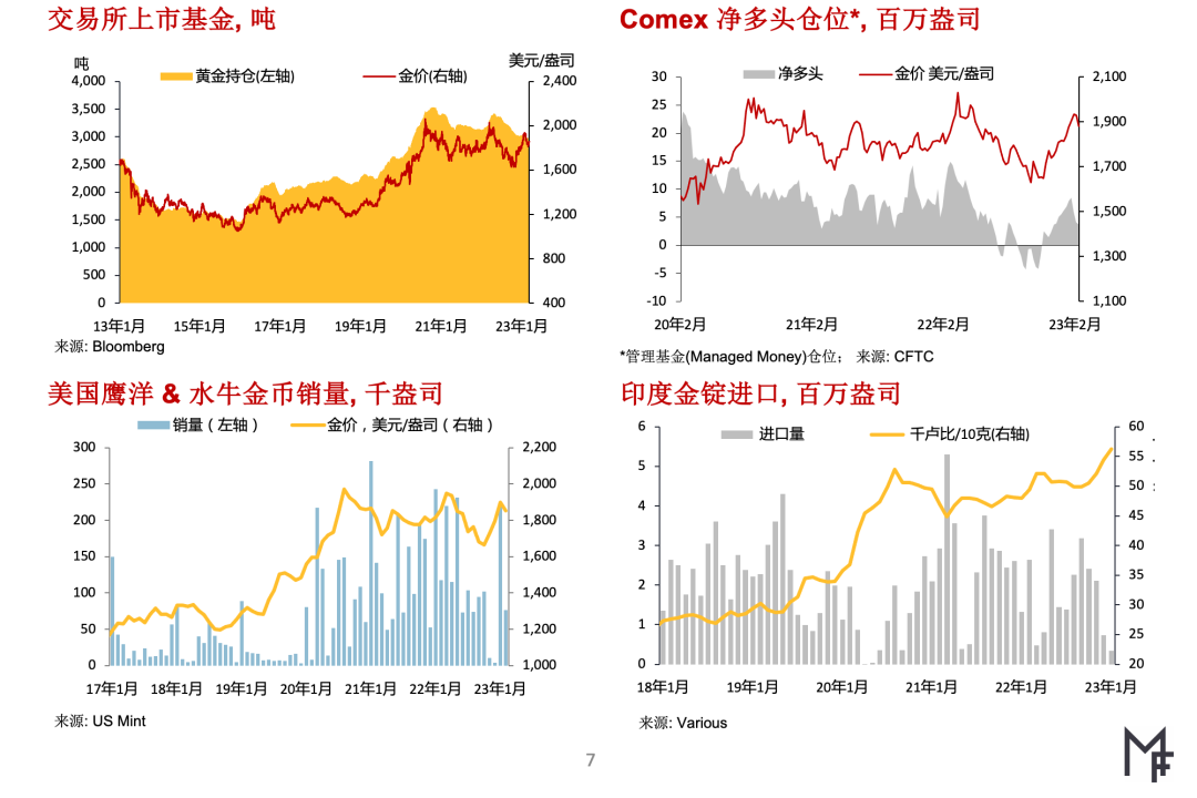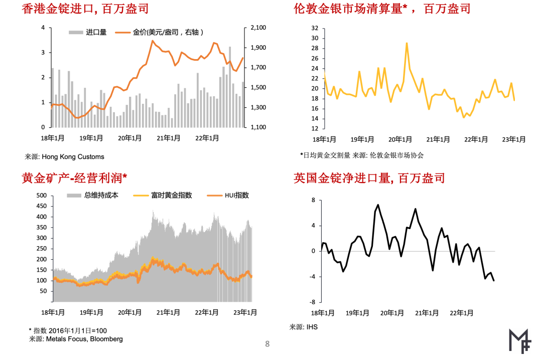 ▶随着金价回落推动需求复苏,2月份印度黄金市场也有所回暖印度消费者正赶在本月后期婚礼季节到来前购买黄金,因此国内市场金价折价从2月初的逾30美元/盎司大幅收窄至4美元/盎司 ▶在中东地区,因2022年全年黄金进口量已达379吨后,2023年1月份进口量月增幅继续创出新高,达83吨,土耳其政府采取了干预措施,在2月中旬后实施新法规,以减缓进口,从而遏制抑制贸易逆差扩大。