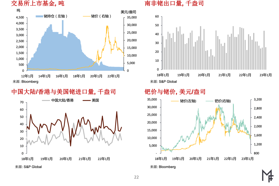 近几月来铑价波动率很低,导致交投十分清淡在这种市况下,因没有大买家入市,小量成交就能把价格压低 ▶发布上期月报以来,我们已将2023年一、二季度的铑价预测值下调(具体价格预测请与我们联系订阅)据我们研判,由于整车制造商库存充足,铑市场前景也偏空,近期内铑价将继续面临下行压力。