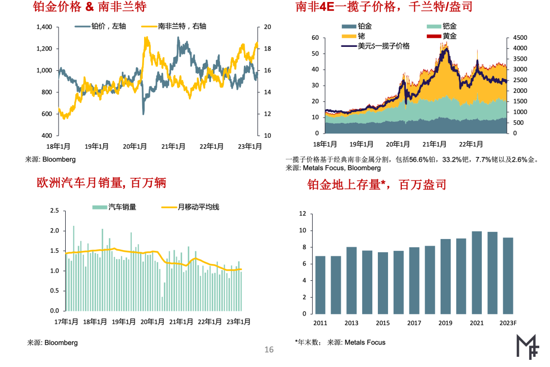 我们预计2023年再生铂金总供应量将回升10%,但因供应链问题持续存在和报废汽车供应量受限,从废汽车催化剂中回收再生的铂金数量则将增长乏力此外,因来自黄金首饰的竞争加剧,中国铂金首饰销量持续承压,这也导致旧铂金首饰回收承压。