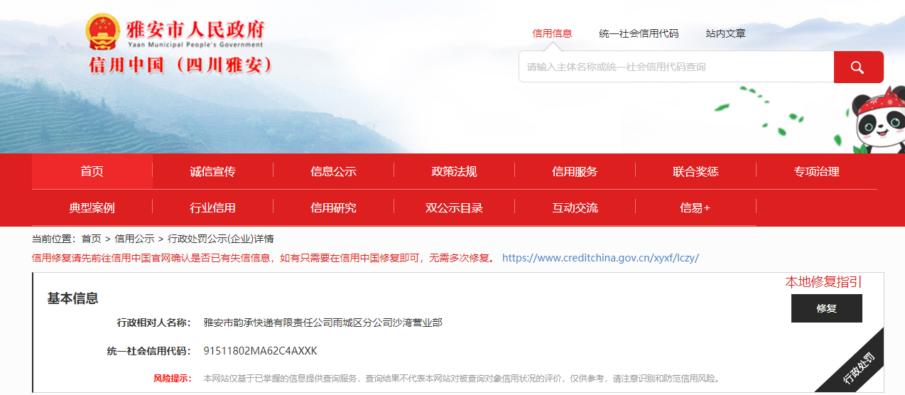 中国质量新闻网讯 近日,信用中国(四川雅安)网站公开行政处罚信息(行政处罚决定文书号:雅雨市监处〔2023〕51180223000102号),涉及雅安市韵承快递有限责任公司雨城区分公司沙湾营业部该营业部使用未经检定的强检计量器具被处罚。
