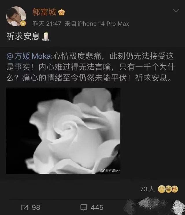 随后,郭富城也转发了这条动态,并配文:“祈求安息。”