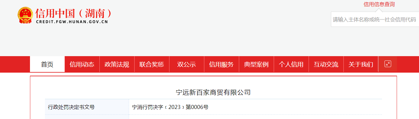 中国质量新闻网讯 据信用中国(湖南)网站消息,近日,湖南省宁远县消防救援大队对宁远新百家商贸有限公司作出行政处罚行政处罚决定书文号:宁消行罚决字﹝2023﹞第0006号行政处罚决定书文号宁消行罚决字﹝2023﹞第0006号。