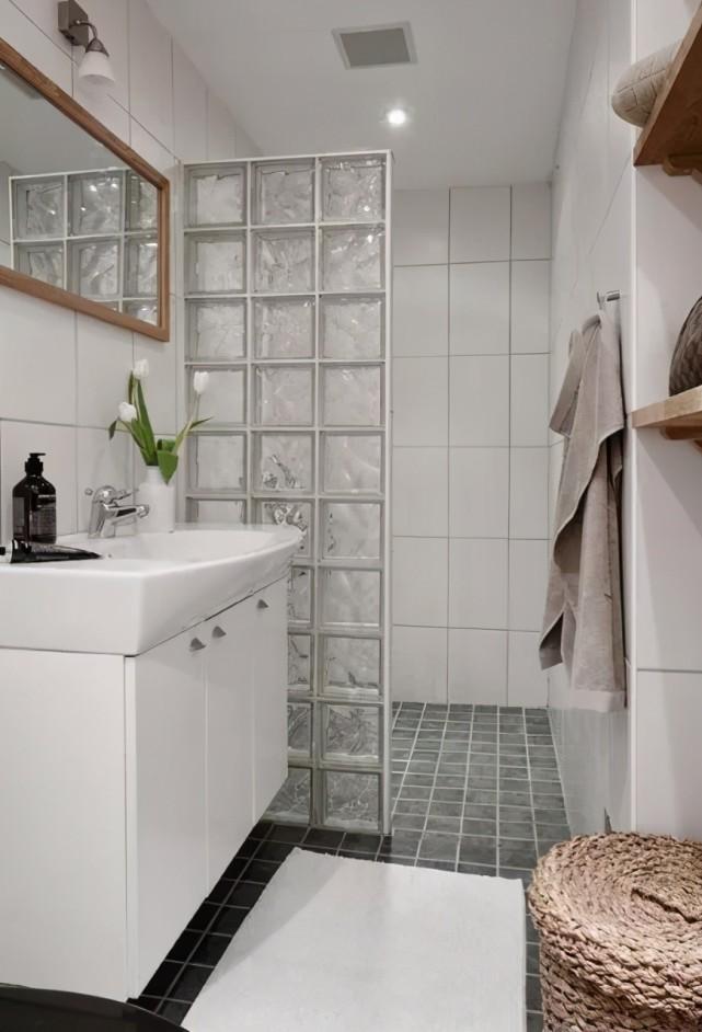 所以,你要是不想在卫生间安装淋浴房的话,不妨试试采用玻璃砖做成隔断墙,省事又方便,还能够根据自己的喜好砌成不同的形状。