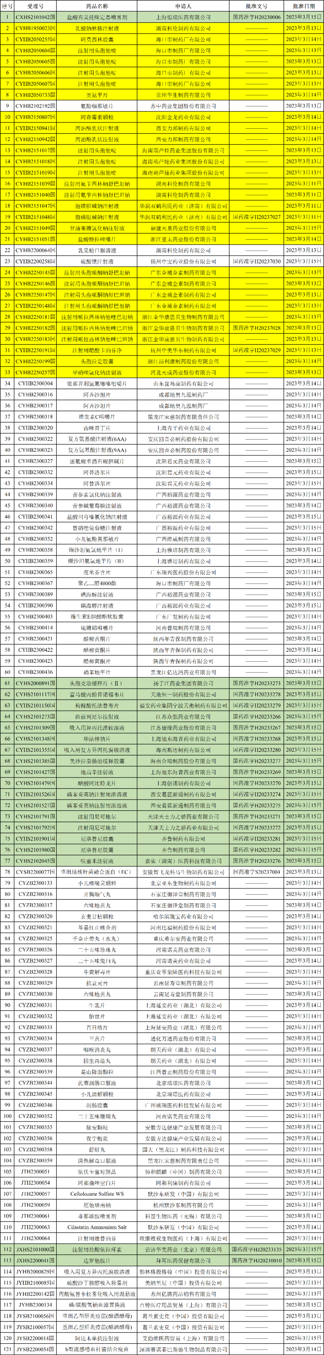 转自:药通社刚刚,NMPA发布2023年03月16日药品批准证明文件送达信息,本批次共有121个受理号获批,其中29个为一致性评价受理号,包括:湖南科伦制药有限公司,2品规注射用氨苄西林钠舒巴坦钠华润双鹤
