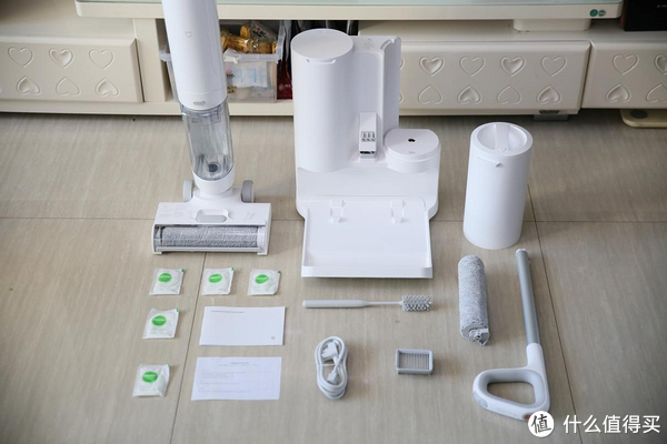 全套配件如上图,从左上至右下依次是洗地机、智能基站、水箱、除垢剂*5、说明书、除垢剂使用指南、清洁刷、电源线、替换滚刷、替换滤芯、洗地机手柄,相当的丰富细节展示图: 米家这款高温无线洗地机,在做工细节上还不错,大厂风范,没有任何毛刺、不贴合等问题。