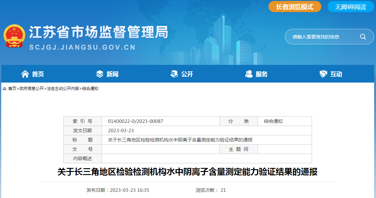 关于长三角地区检验检测机构水中阴离子含量测定能力验证结果的通报苏市监检测〔2023〕56号各市、县(区)市场监管局,各有关检验检测机构:为加强检验检测机构协同监管,推动长三角检验检测高质量一体化发展,根据《上海市市场监管局 江苏省市场监管局 浙江省市场监管局 安徽省市场监管局关于组织开展2022年长三角地区检验检测机构能力验证工作的通知》(沪市监认检〔2022〕354号)部署安排,江苏省市场监管局牵头开展了长三角地区检验检测机构水中阴离子含量测定能力验证。