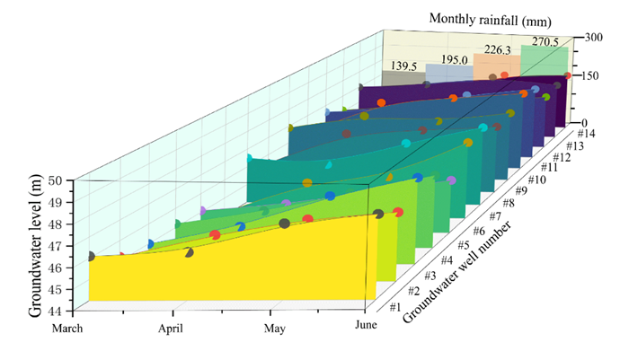 图2:地下水长期监测及区域降雨量变化结合原冶炼生产工艺,将研究地块分为物料堆存区、焙烧炉区、熔炼铸锭区,按照10m×10m网格,布设土壤点位93个、地下水监测井14口,2021年3-7月,定期开展地下水位监测。