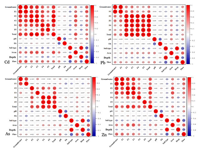 图7:土壤-地下水重金属赋存形态与影响因素的相关性选择水文地质特征(地下水流累积量和土层类型)、土壤理化性质(pH和Eh)、冶炼活动类型等6个因素,通过相关性分析解释重金属的迁移模式冶炼场地土壤-地下水系统呈现出中性至碱性(6.4-11.4)、轻度氧化至强还原性条件(-224至171 mV),这有利于重金属向稳定态过渡。