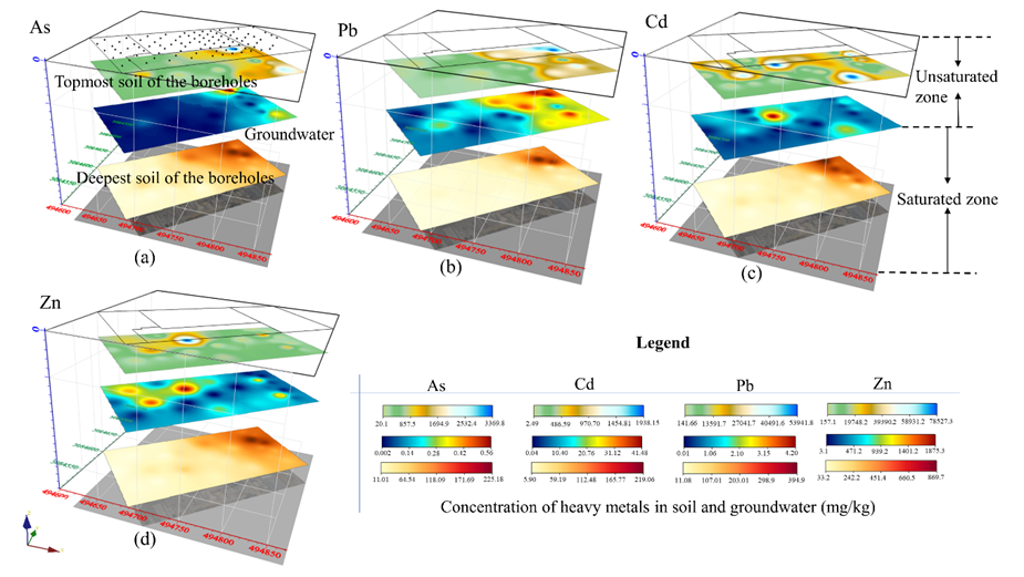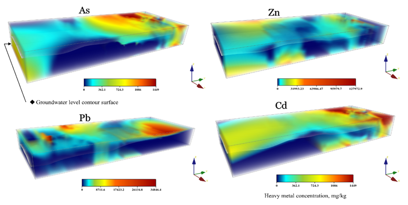 图5:土壤地下水中重金属分布与扩散的模拟通过整合水文地质数据、土壤和地下水重金属数据以及地下水流场数据,模拟研究土壤-地下水系统中重金属的分布和扩散情况,直接获取整个系统中重金属的污染量污染量的排序为 Cd(55.8%)>As(52.1%)>Pb(30.9%)>Zn(27.5%)。