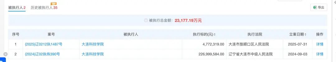 ”同日,记者致电该校主管部门辽宁省教育厅,电话无人接听记者注意到,《致全体教职员工一封信》的落款时间为8月5日根据天眼查信息显示,大连科技学院共有2条被执行人信息,被执行总金额超2.3亿元;共有35条历史被执行人信息,被执行总金额超35亿元。