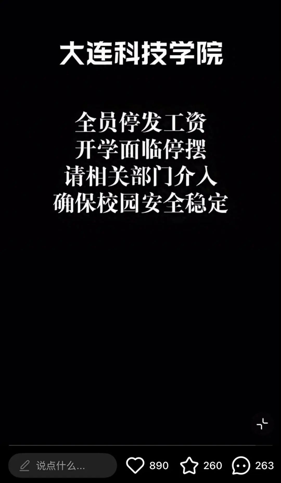 评论区流传出该校内部信8月23日,记者以家长身份致电大连科技学院求证此事,学校院办工作人员证实网传的《致全体教职员工一封信》内容属实,但表示“现在学校已经在解决这个问题了,政府不可能让学校停止运行,我们老师马上都上班了。