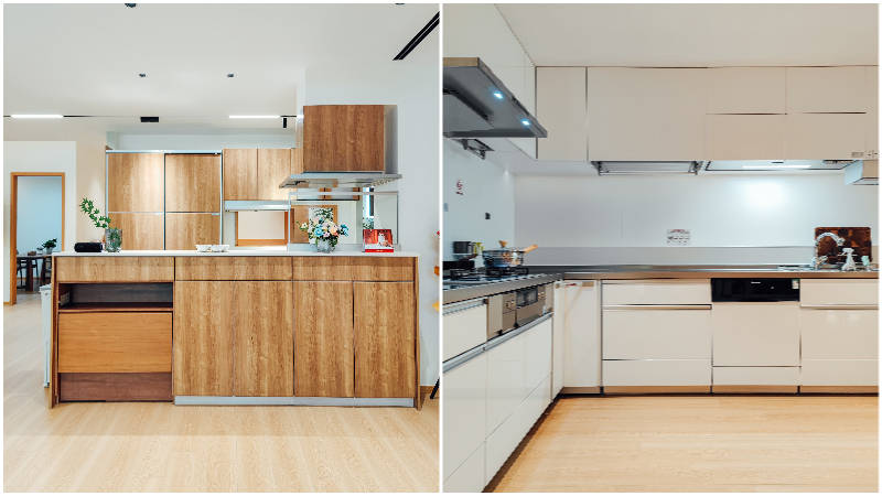 厨房:日式橱柜,家务减半·收纳翻倍!百本木家的日式厨房设计以实用性、去家务化著称收纳动线设计规划顺应人的使用习惯,最常用的物品都收纳在手边,想要用的工具,轻松就能取出不锈钢台面/柜体,一擦即净,减少不必要的家务!空间巧分层,台面清爽,做饭效率高50%。