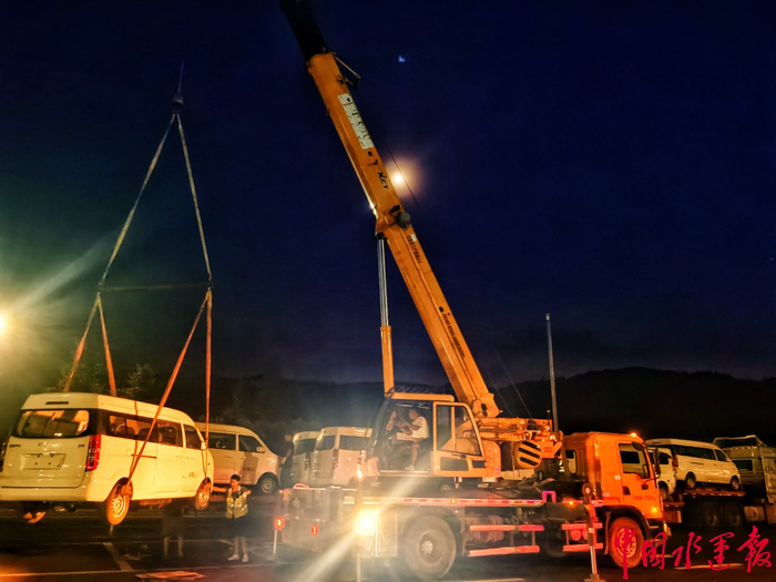 图为挂车违规运输情况 当日18时30分,交通运输执法、公安交管部门组成联合执法组在S26酉沿高速小河服务区将该车拦截经查,该车车头证件齐全,但挂车悬挂超限临牌,未取得《道路运输证》,却违规并排装载10台崭新商品车,远超安全装载标准。