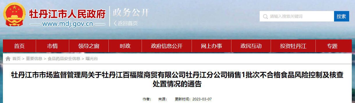 牡丹江市市场监督管理局关于牡丹江百福隆商贸有限公司牡丹江分公司销售1批次不合格食品风险控制及核查处置情况的通告在国家市场监督管理总局组织的食品安全抽检工作中,检出我市牡丹江百福隆商贸有限公司牡丹江分公司销售的1批次不合格食品。