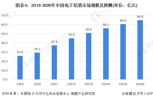 量价齐升带动电子铝箔市场规模增长近年来由于上游铝的价格震荡上升,需求量和价格的增长使得中国电子铝箔市场规模快速增长根据中国电子元件行业协会公布的相关信息测算,2021年中国电子铝箔市场规模达到37.3亿元,同比增长28%,预计到2026年中国电子铝箔市场规模将达到64.9亿元。