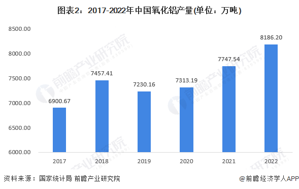 根据国家统计局的数据,2017-2022年中国氧化铝产量波动上升,2022年中国氧化铝产量上升至8186.20万吨,同比增长5.7%
