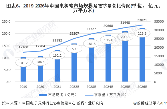 目前,专业电极箔厂商和铝电解电容器厂商是电极箔生产的主要企业2019-2021年中国电极箔市场规模及需求量同步上升,2021年中国电极箔市场规模和需求量达到132.2亿元以及21182万平方米预计到2026年两者将分别达到223.5亿元以及33021万平方米。