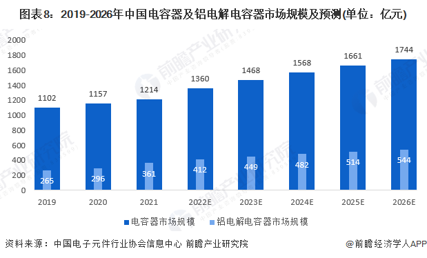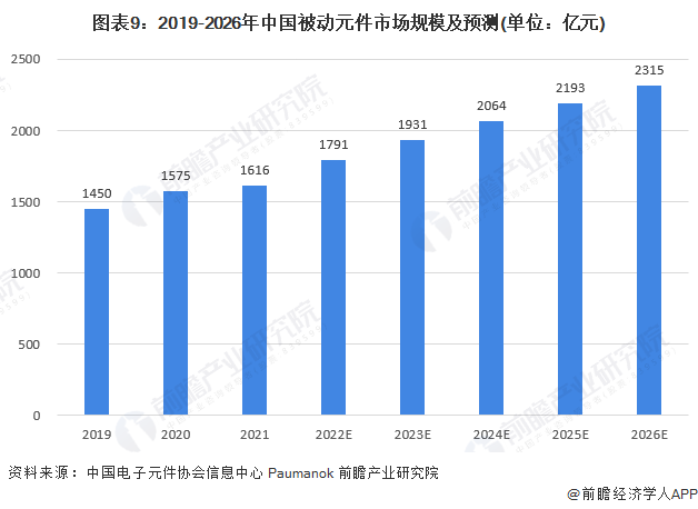根据中国电子元件协会信息中心及Paumanok公布的数据,我国被动元件市场规模由2019年的1450亿元增长至2021年的1616亿元预计2022-2026年中国被动元件的复合增长率约为6.6%,到2026年中国被动元件市场规模将达到2315亿元。