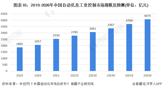 根据中国工控网发布的《2021年中国自动化市场白皮书》,2021年中国自动化及工业控制市场规模达到2530亿元,同比增长23%,市场需求庞大此外,中控网预测,未来几年中国自动化及工业控制市场规模将保持10%左右的年均复合增长率增长,到2026年中国自动化及工业控制市场规模将达到4075亿元。