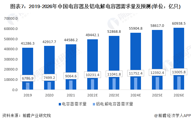 从需求量来看,2021年中国铝电解电容器及整体电容器需求量分别达到9064.6亿只和44586.2亿只,预计到2026年中国铝电解电容器及整体电容器需求量将达到13005.8亿只和60938.5亿只