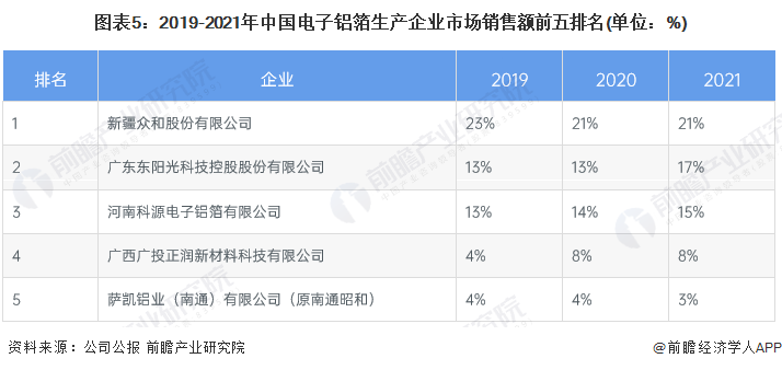 国内从事电子铝箔的公司主要有新疆众和股份有限公司、广东东阳光科技控股股份有限公司、河南科源电子铝箔有限公司、广西广投正润新材料科技有限公司和萨凯铝业(南通)有限公司,其市场份额如下: