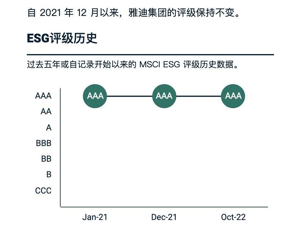 MSCI给雅迪控股的ESG评级雅迪在MSCI ESG评级上拿到了亮眼的AAA雅迪控股是首家拿到MSCI ESG评级最高等级AAA级的中国企业,一度是MSCI ESG评级榜单上标杆一样的存在彼时,雅迪AAA的意义不仅在于对这家电动车企业本身ESG举措的肯定,更重要的是打消了很多企业的疑虑:即使MSCI ESG评级对中国企业存在“偏见”,冲击最高评级也并非全无可能。
