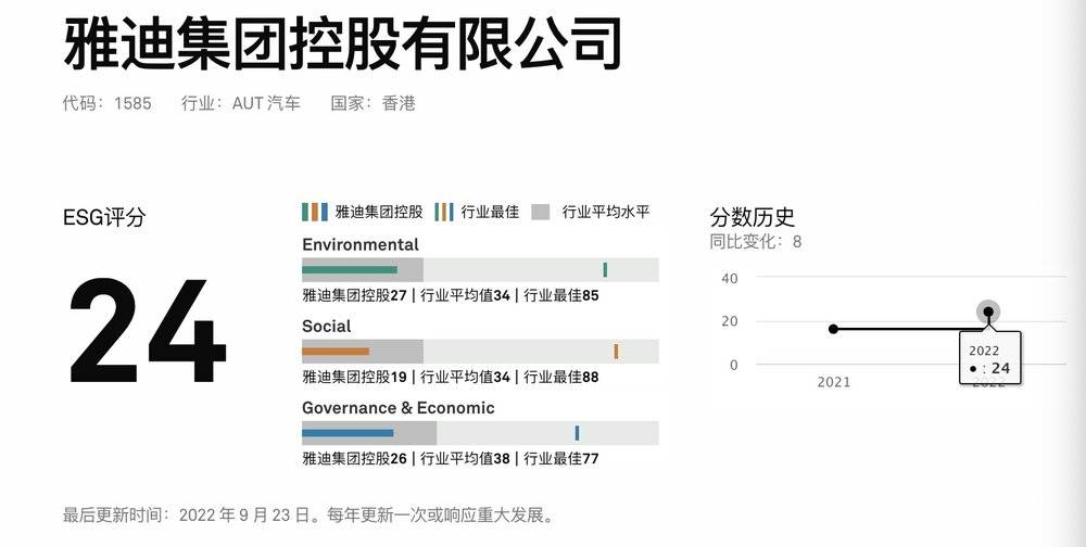 左:雅迪控股去年10月之前的关键问题分布,右:雅迪控股目前的关键问题分布 “碳足迹”跌下神坛事实上,雅迪的AAA一直难以服众MSCI的ESG评级尽管权威,但也只是一家之言标普对于雅迪的评级与其存在天壤之别,只给了24的评分,并且判定雅迪在E、S、G三方面均低于行业平均水平。