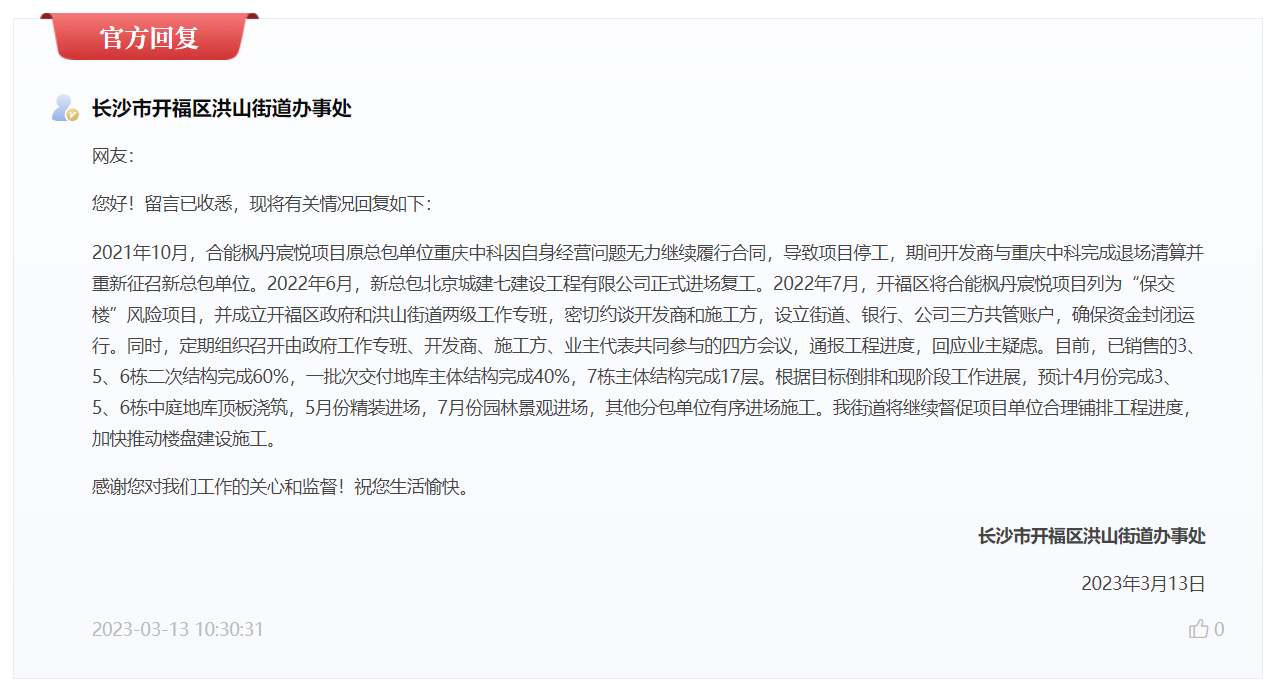 3月13日,长沙市开福区洪山街道办事处对业主投诉予以公开回复:2021年10月,合能枫丹宸悦项目原总包单位重庆中科因自身经营问题无力继续履行合同,导致项目停工,期间开发商与重庆中科完成退场清算并重新征召新总包单位。
