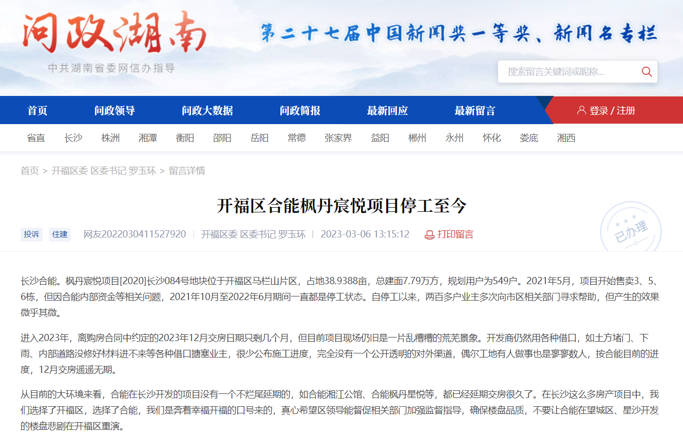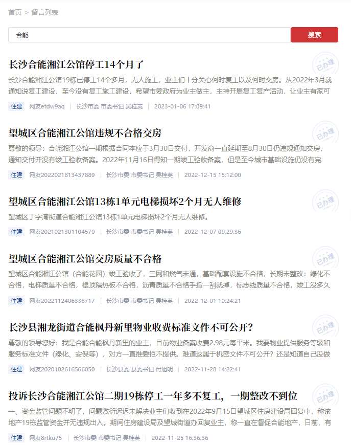 中国质量新闻网搜索发现,在红网问政湖南平台上,长沙“合能系”楼盘遭受了诸多投诉维权,内容涉及“停工”“违规交付”“违规收取物业费”等不同方面。