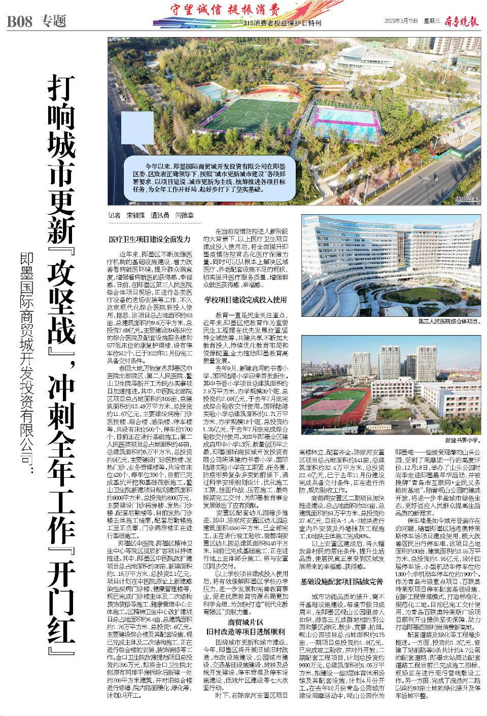 2022年即墨全区建成启用中小学13所,数量创历年之最,即墨国际商贸城开发投资有限公司所承建的书香小学、国际陆港实验小学在工期紧、任务重、防疫形势复杂多变的前提下,通过科学安排规划设计、优化施工工期,挂图作战、压茬施工,最终按期完工交付,为即墨教育事业发展做出了应有贡献。
