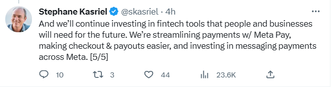 加密行业受打击 周一,Kasriel还指出,“我们将继续投资于人们和企业未来需要的金融科技工具。我们正在通过Meta Pay简化支付,让结账和付款变得更容易,并投资于Meta的消息支付功能。”