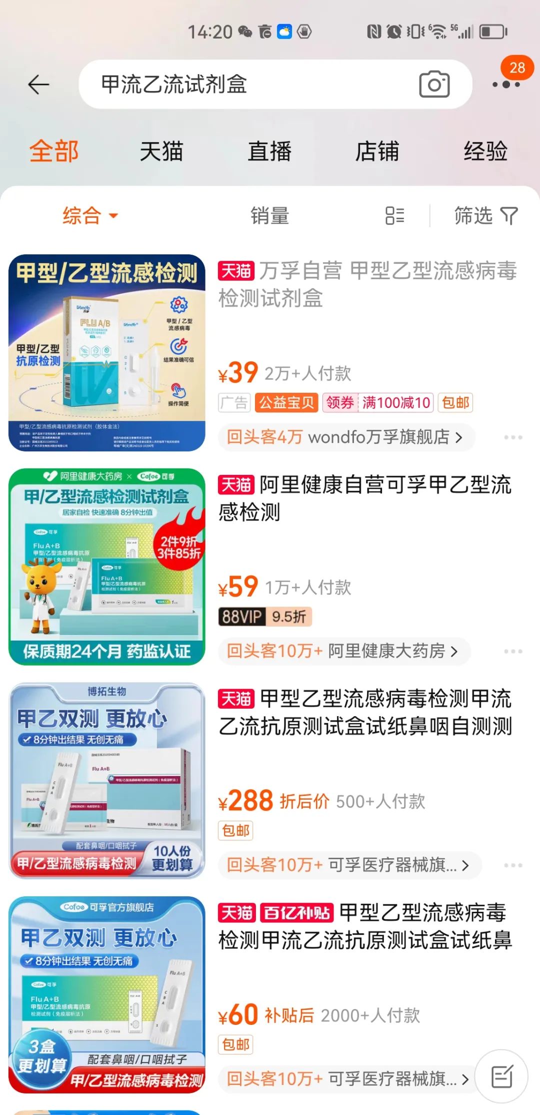 线上火爆 相关产品最高销量超2万3月15日,记者搜索了多家电商平台,销量最高的某品牌甲型/乙型流感病毒抗原检测试剂盒的月销量已超过2万单,单检甲流的1人份试剂盒卖39元,甲流乙流都能测的1盒69元检测方法和新冠抗原检测产品类似,用无菌拭子采集鼻腔、咽喉的分泌物,插入样本提取管中的溶液,但是不同品牌的等待时间不一样。