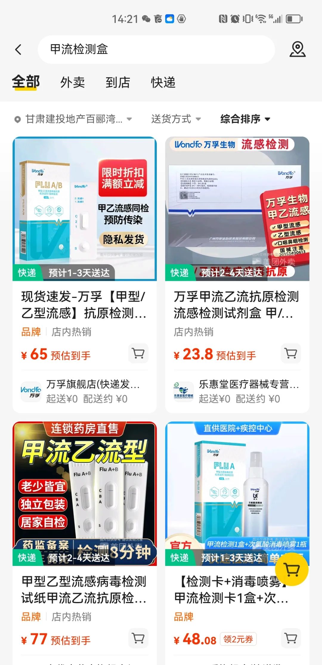 ”有业内人士表示我市连锁药店销售热情不高在美团App上,搜索“甲流检测”,几乎所有相关商品都无法当天送达,商品页面只能承诺“24小时内发货”或“预计1—3天送达”搜索“外卖”和“到店自取”显示结果为“暂无”。