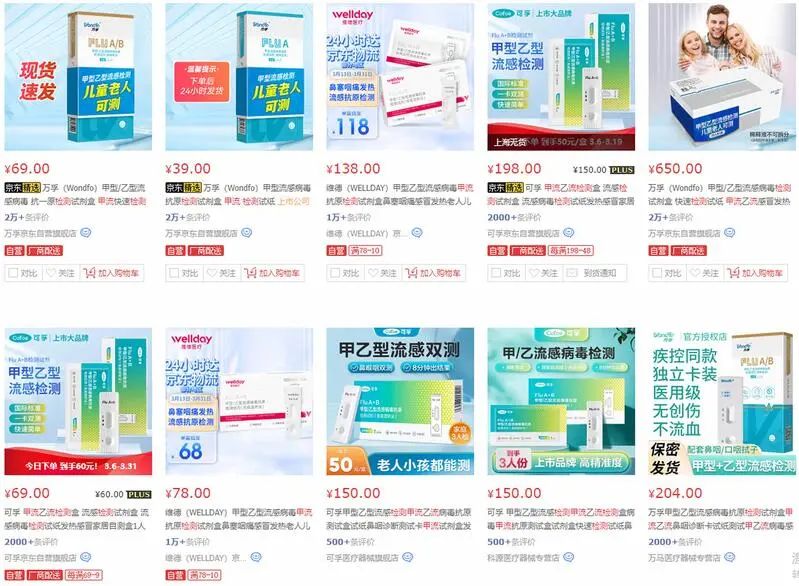 平台上展示页面显示,销量最高的某品牌甲型/乙型流感病毒抗原检测试剂盒的月销量已超过2万单,单检甲流的1人份试剂盒卖39元,甲流乙流都能测的卖69元