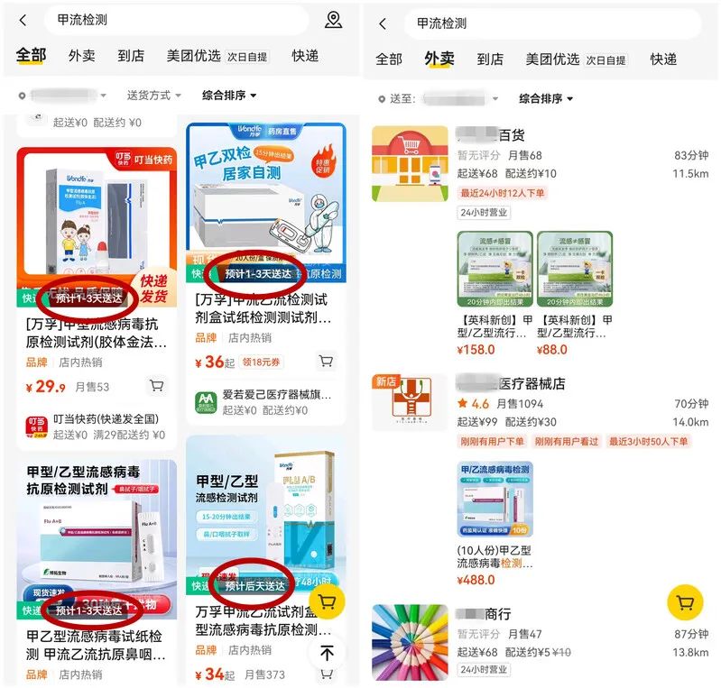 就连一向“神通广大”的外卖APP也没了准信搜索“甲流检测”,几乎所有商品都无法当天送达,商家们只能承诺“24小时内发货”,或者“预计1-3天发货”而附近能够派送的商家基本10公里起步,但不是正规药店,资质存疑。