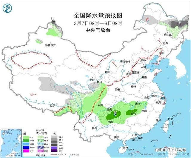 全国降水量预报图(3月7日08时-8日08时)中央气象台网站3月7日消息,8日夜间至9日,一股强冷空气将影响新疆,新疆北部将出现6~8级大风、山口地区阵风可达10~12级,气温下降6~10℃,局地降温12℃以上;新疆西北部和沿天山地区有中到大雪或雨夹雪,局地有暴雪。