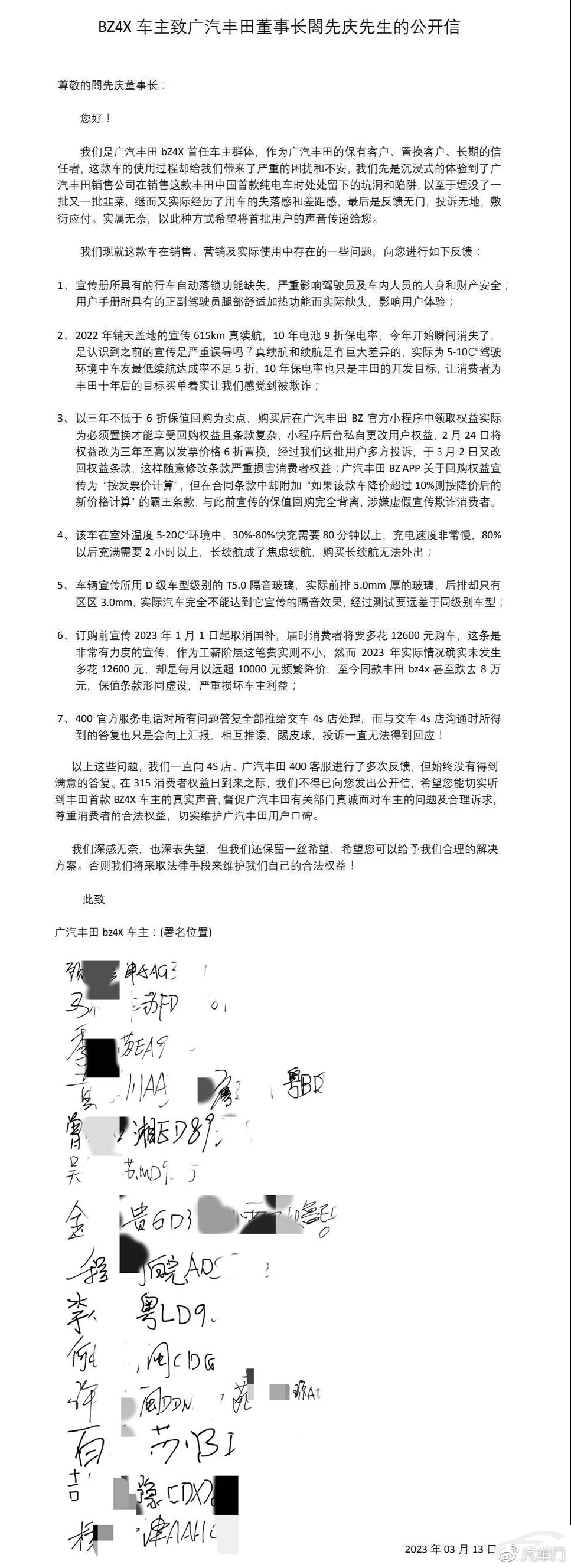 正值3·15期间,多位广汽丰田bZ4X车主集体维权,并在网上发布联名撰写《bZ4X车主致广汽丰田董事长閤先庆先生的公开信》。此事一出,迅速引起社会多方广泛关注。