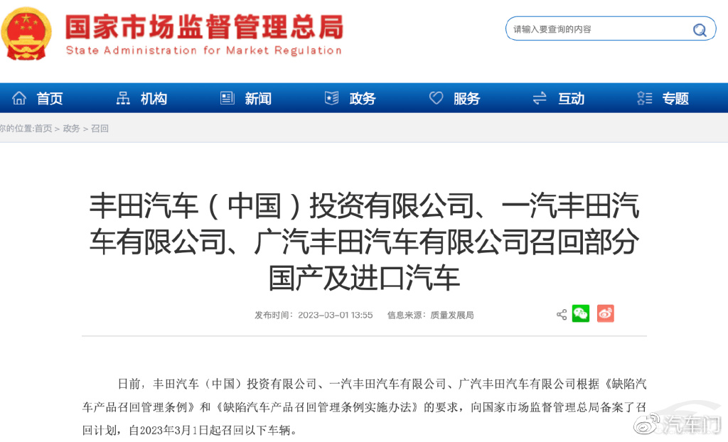 2023年3月1日,广汽丰田召回2022年11月15日至2023年2月3日期间生产的部分bZ4X汽车,共计6159辆召回公告称,本次召回范围内的车辆由于安全驾驶辅助系统中前置摄像头的内部程序不当,当车辆通过侧方有连续停放车辆的道路时,对目标识别可能产生差异,导致安全驾驶辅助系统(TSS/LSS+)可能意外重启。