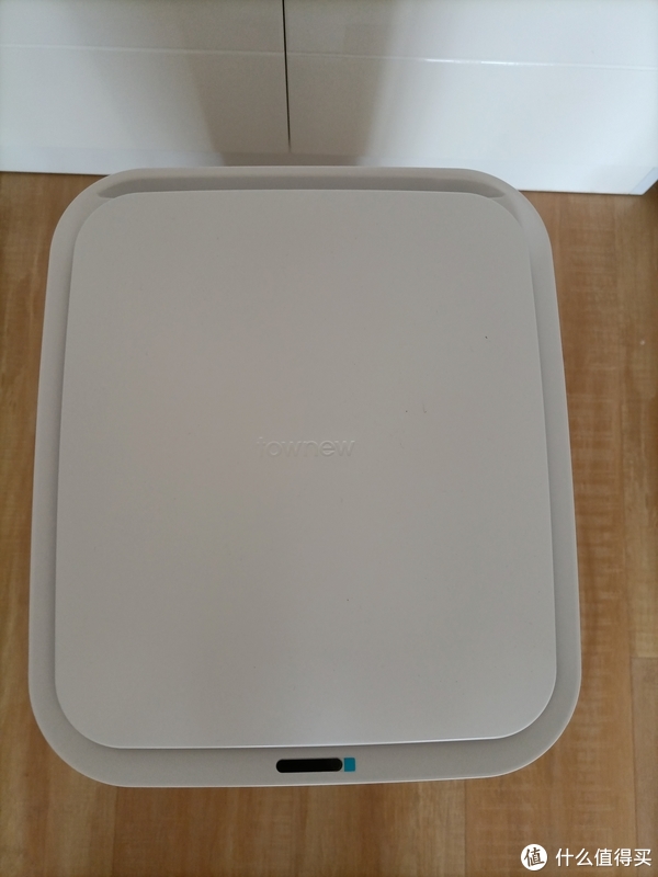 拓牛T1S的盖子的材质与垃圾桶材质相同,垃圾桶的盖子中心位置是拓牛的logo,盖子前面是有一个home键,长按的话垃圾桶就会打包垃圾。