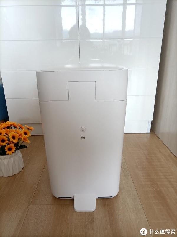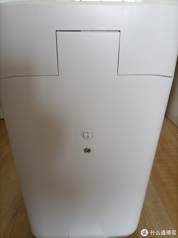 T1S的垃圾桶后方有一个突出,这个是为了放置垃圾桶的时候和墙壁可以留一点距离,这样子可以为打包垃圾袋留出充足的空间,充电口和开关都在垃圾桶的背面。