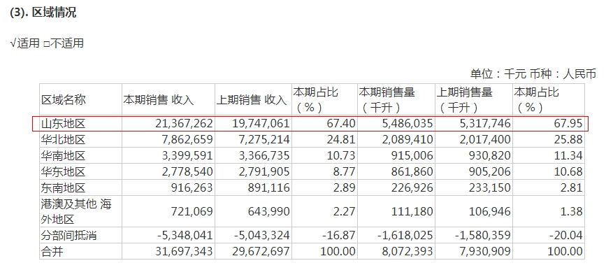 来源:公告 (下同) 分地区看,青岛啤酒在山东地区销售收入达到213.67亿元,占当期销售占比67.4%;华北地区销售收入78.63亿元,占比24.81%;华南地区销售收入34亿元,占比10.73%;华东地区销售收入27.79亿元,占比8.77%。