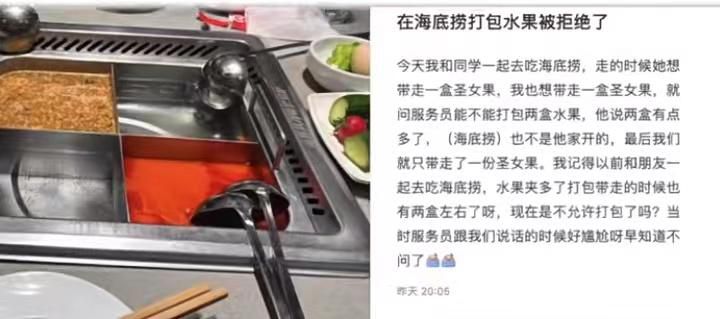 最近海底捞又出新规定,引起了网友们的热议据江西网友爆料,在海底捞用餐结束后,想打包两盒圣女果,却被服务员拒绝了该网友表示以前在海底捞是可以带走两盒左右的,可是现在只能打包一盒了不少网友也分享了自己曾经在海底捞打包过多种水果的经历。
