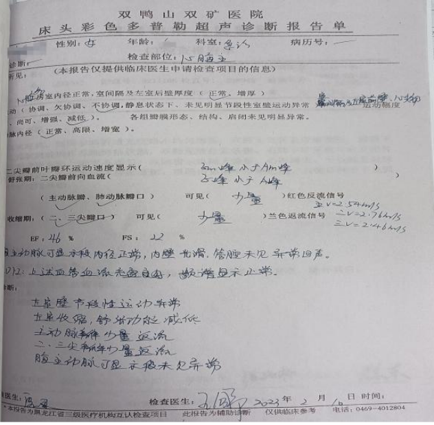 心脏超声(2023年02月10日)示:左室壁节段性运动异常,左室收缩、舒张功能减低,主动脉瓣少量返流,二、三尖瓣少量返流,腹主动脉可显示段未见异常,EF:46%。