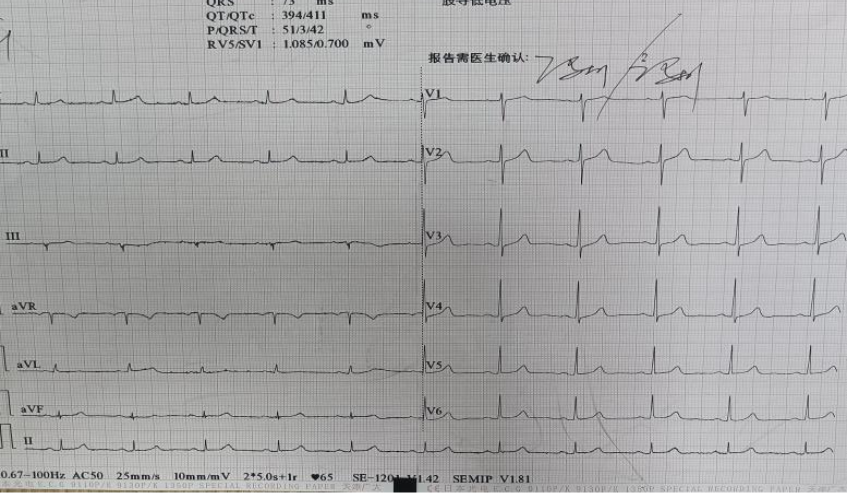 复诊情况治疗一个月后复查,患者自诉生活规律作息,无胸痛症状,一般日常活动无不适感,和正常人无异。常规心电图(2023年03月22日)示:窦性心律,正常范围心电图。较前明显改善。