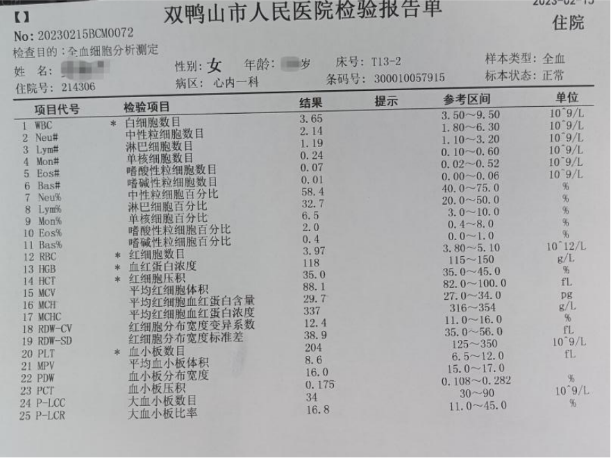 2023年02月10日):血常规:各项指标正常,未发现异常情况。