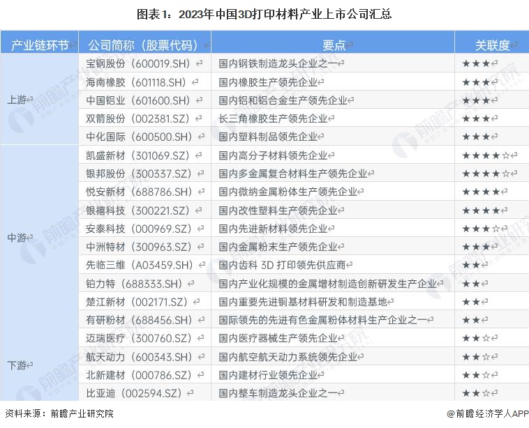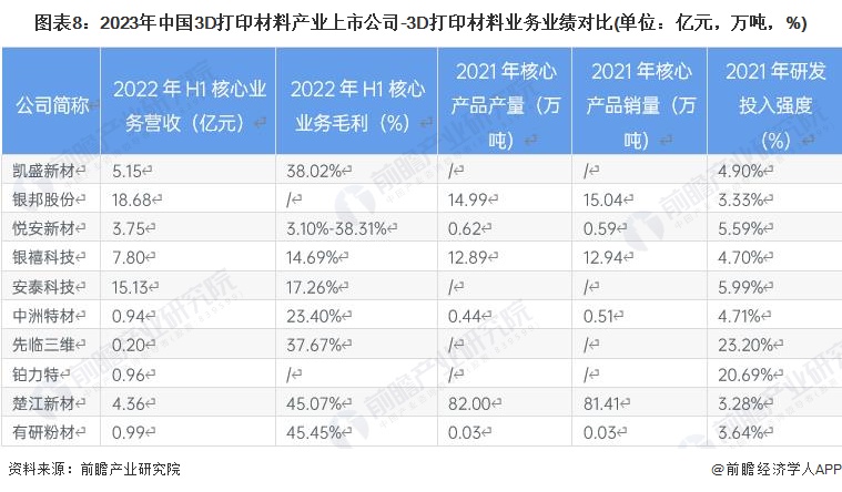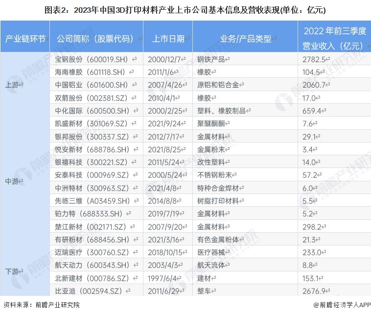 银邦股份(300337.SZ);悦安新材(688786.SH)等本文核心数据:上市公司营业收入;上市公司3D打印材料业务毛利率;上市公司3D打印材料业务营收占比等1、3D打印材料产业上市公司汇总3D打印材料产业原材料、中游产品生产以及下游应用领域的上市企业数量众多,中游企业包括楚江新材(002171.SZ)、有研粉材(688456.SH)、